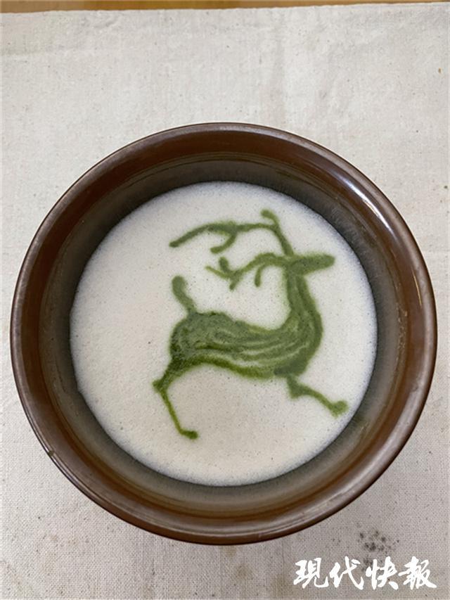 清洗茶盏、准备茶粉,徐萍正在做着准备工作。点茶开始,只见她左手扶住茶盏,右手握住茶筅,前后快速摆动,不一会儿茶盏中就泛起了白色的沫饽。然后向茶汤中加入沸水,顺时针方向搅动茶汤,沫饽逐渐浓稠。完成点茶之后,她用抹茶膏画了一支荷花。